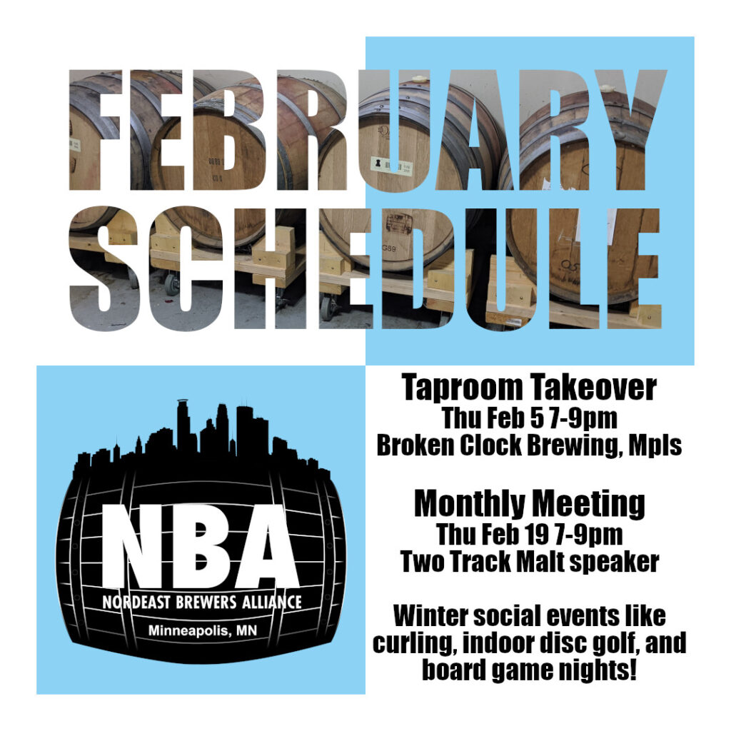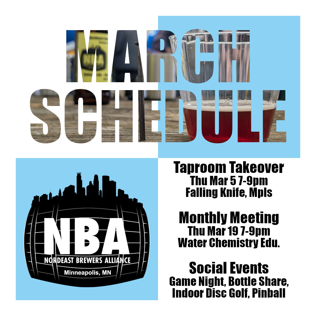 This month we can hopefully get outside again — disc golf, bottle shares, and brewing on outdoor kits! A perfect time to set up some Maibock or brew something dark and rich for late winter sipping. Coming up in a few days is the Taproom Takeover at Falling Knife this time. In a couple weeks is the monthly meeting with water chemistry education.